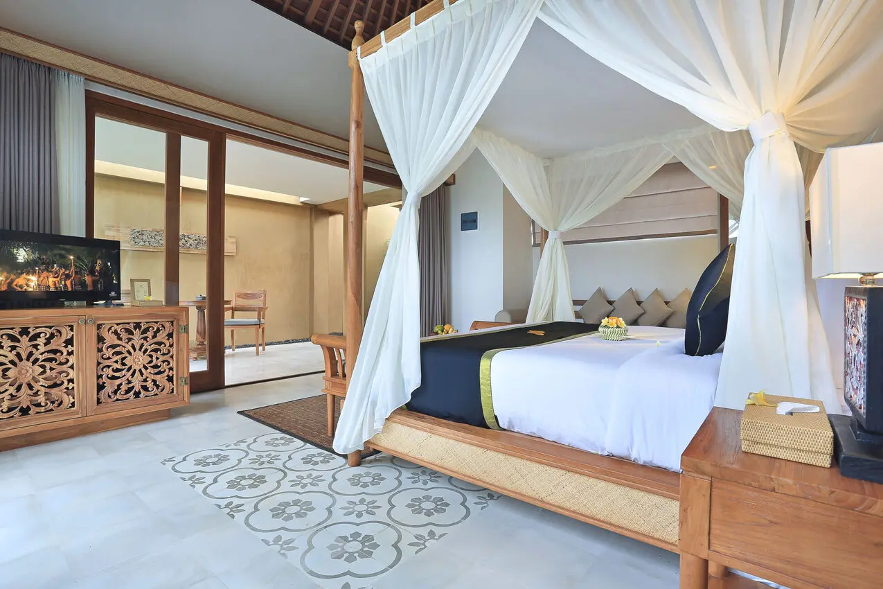 Capturing the complexity of the Ubud Palace’s grandeur artistic style, each villa is resplendent with priceless artifacts and original artworks. The villa offers breath-taking view over rice fields and local Balinese compound and luxurious furnishings with intricate inlays and gilt brushworks. Enjoy your favorite book on one of the upholstered armchairs, ottomans or couches with a glittering chandelier hung over it. Perfected with private plunge pool and set of sun-loungers on gleaming natural stones, it gives you no reason to be anywhere else but there.