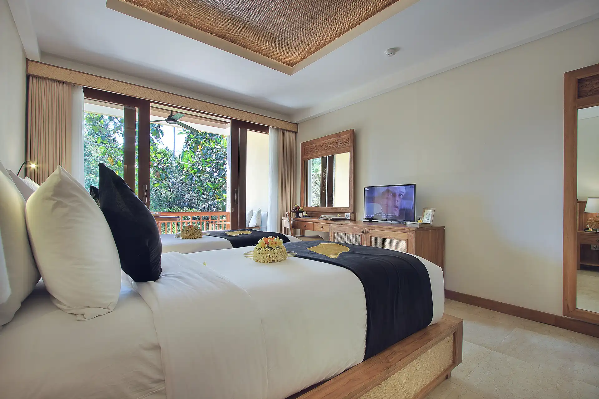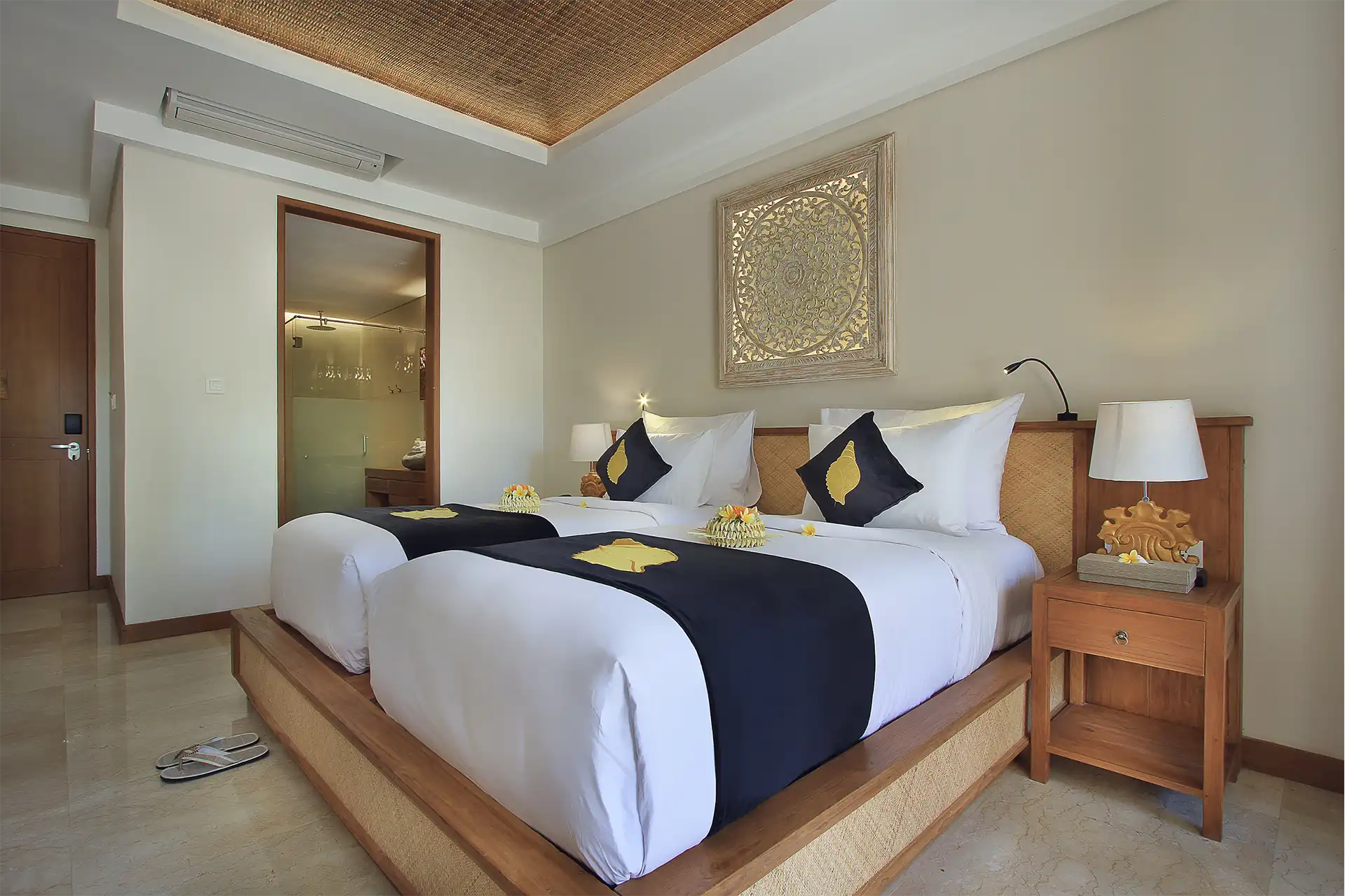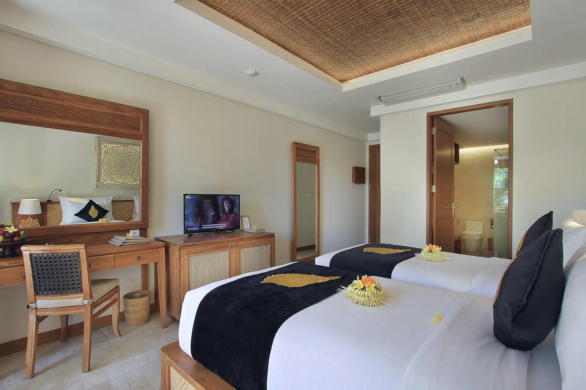 Twin bed room with private veranda inspired by the earthy colors of nature, the suites come in crème light color walls and natural wood ornament furnishing. The suite’s ambiance replicates the ancient Ubud palace architectural elements. The partial natural weaves ceiling and hand-carved wooden headboards with mesmerizing backdrop light serve as vocal point of the room