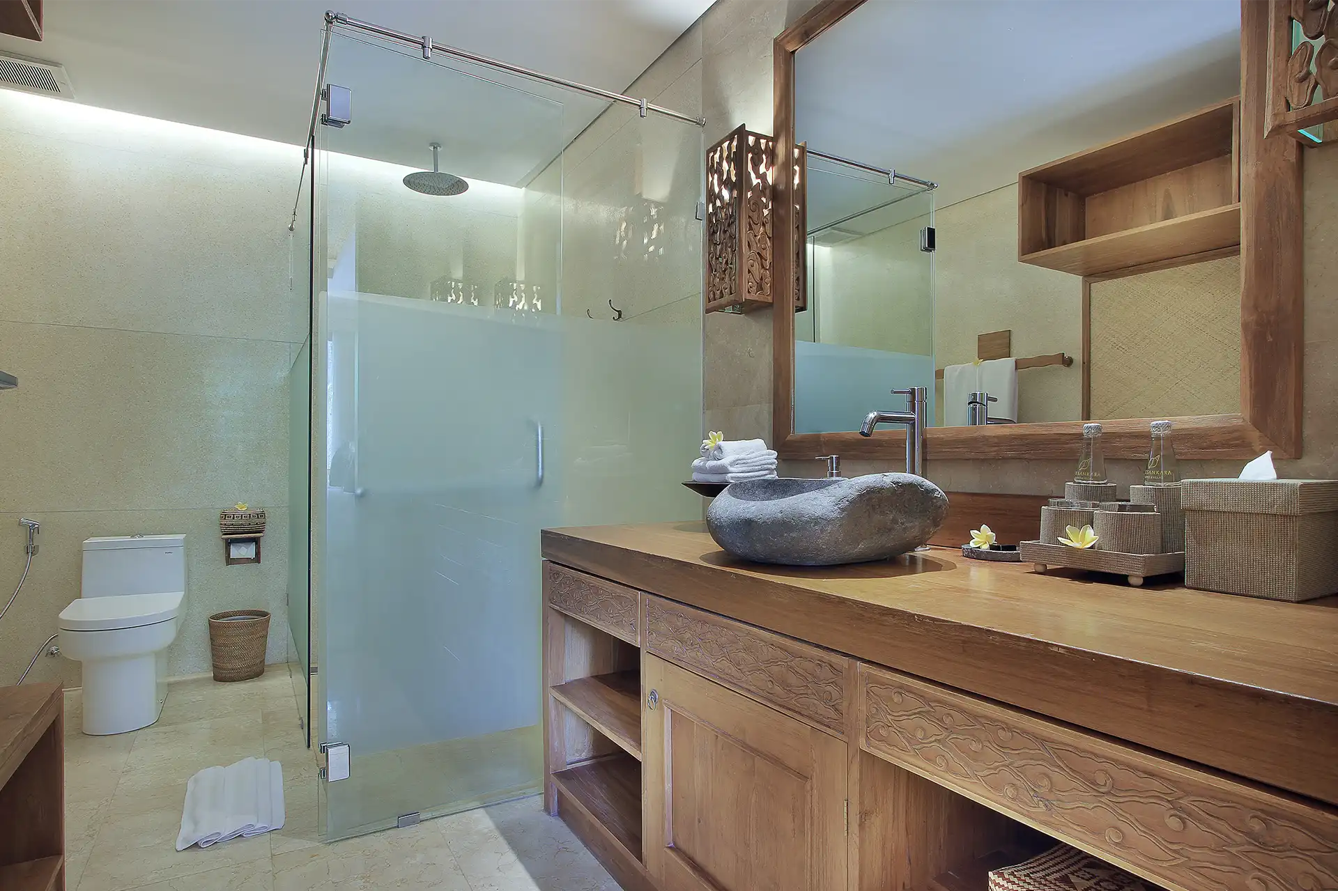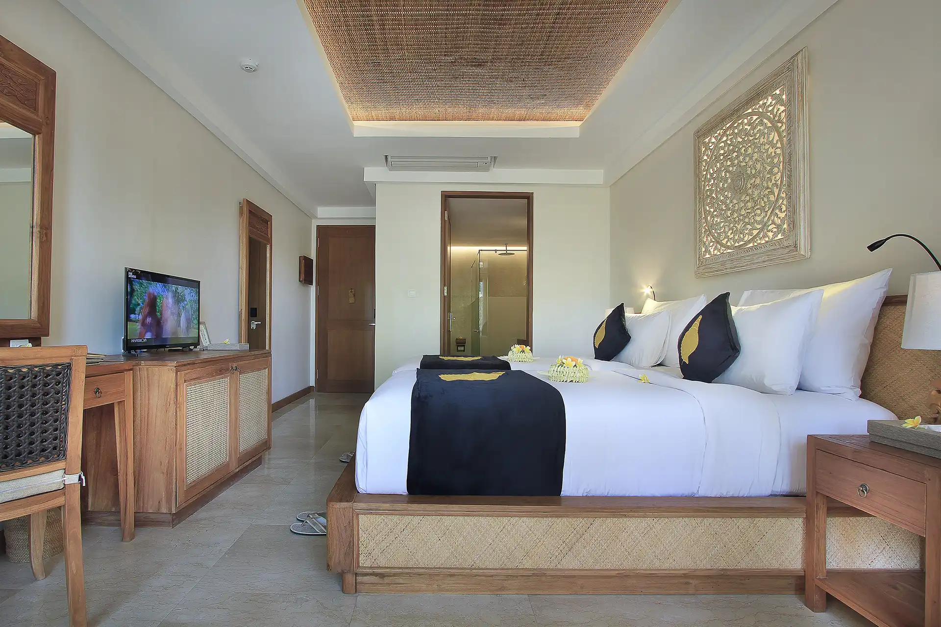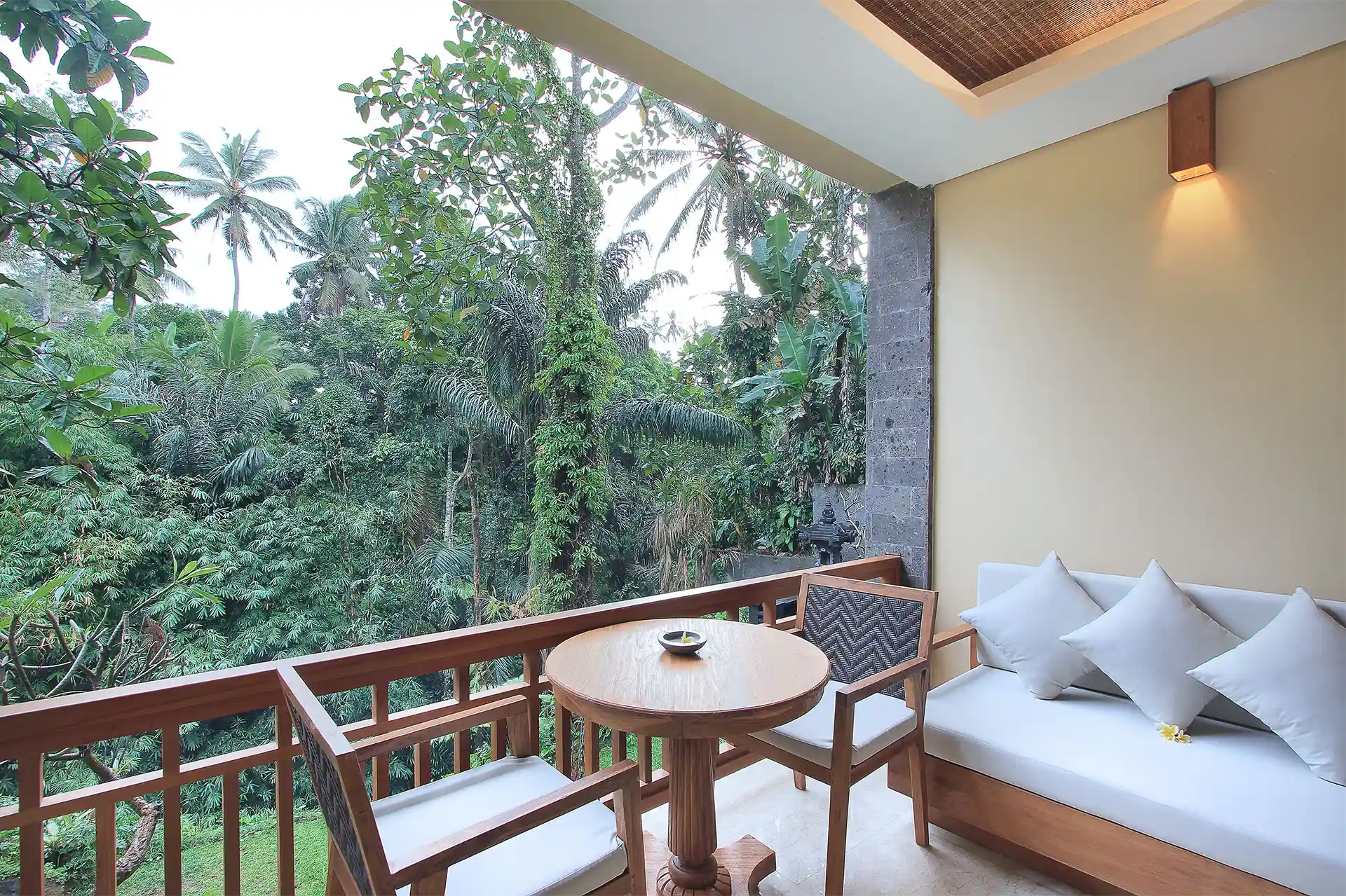 Twin bed room with private veranda inspired by the earthy colors of nature, the suites come in crème light color walls and natural wood ornament furnishing. The suite’s ambiance replicates the ancient Ubud palace architectural elements. The partial natural weaves ceiling and hand-carved wooden headboards with mesmerizing backdrop light serve as vocal point of the room